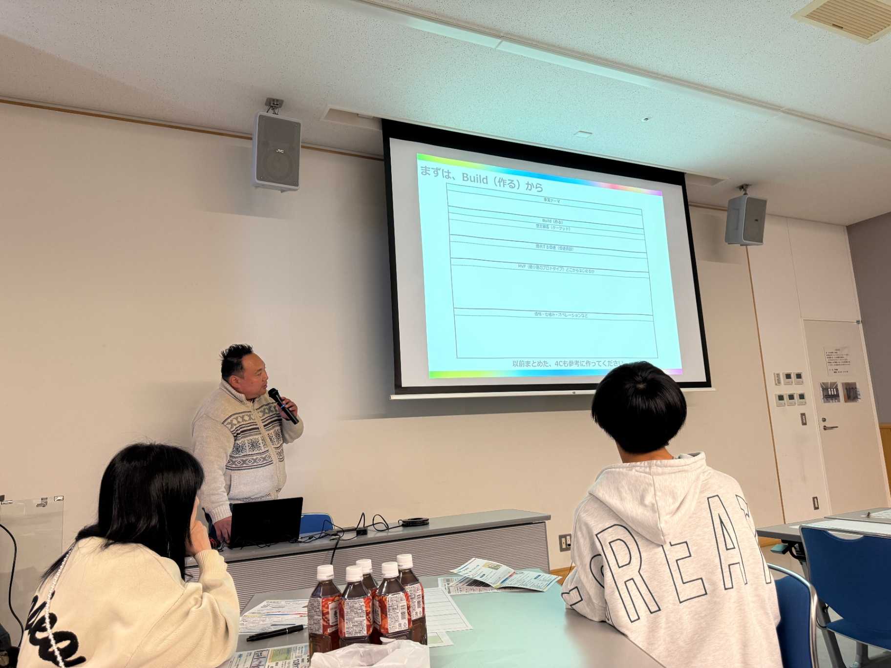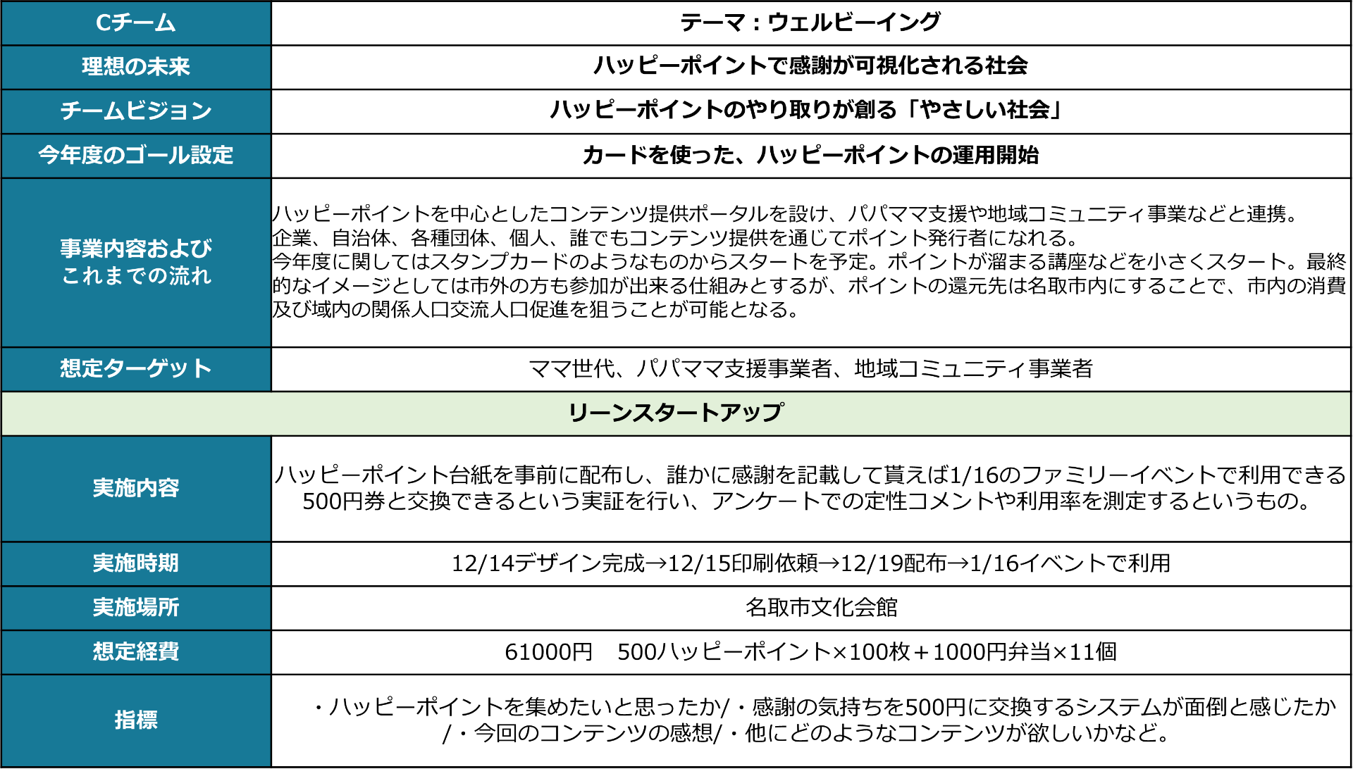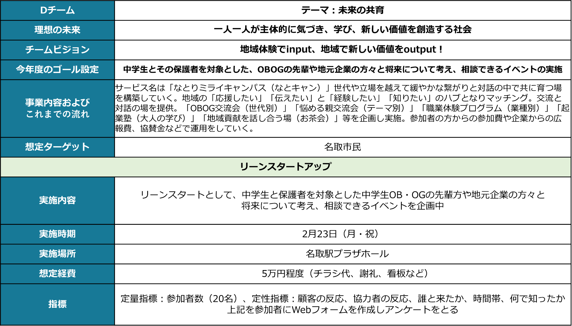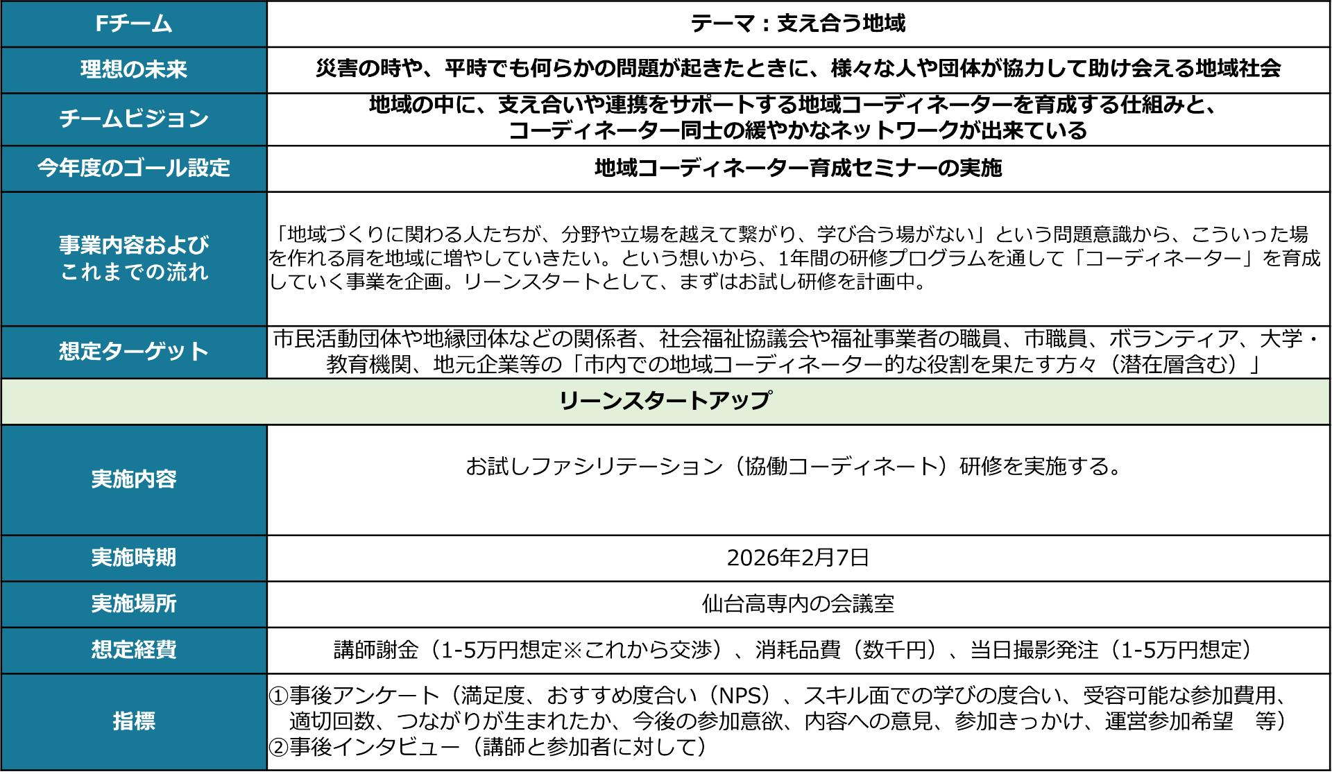 7回目はリーンスタートアップ(実証と仮説化・小規模実行)を解説し、その後各チームで今年度実施する小規模事業の内容を具体化。実施時期、実施内容、必要経費、実施フィールドを検討。